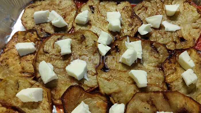 Finito di friggere e scolate le melanzane, facciamo a pezzetti la mozzarella che come dicevo si potrà usare anche quella adatta per la pizza e poi iniziamo con la teglia.