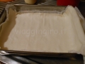 Prendiamo ora una teglia e rivestiamola di carta da forno (*), quindi stendiamoci sopra la nostra sfoglia lasciandone un po’ da parte per le decorazioni;